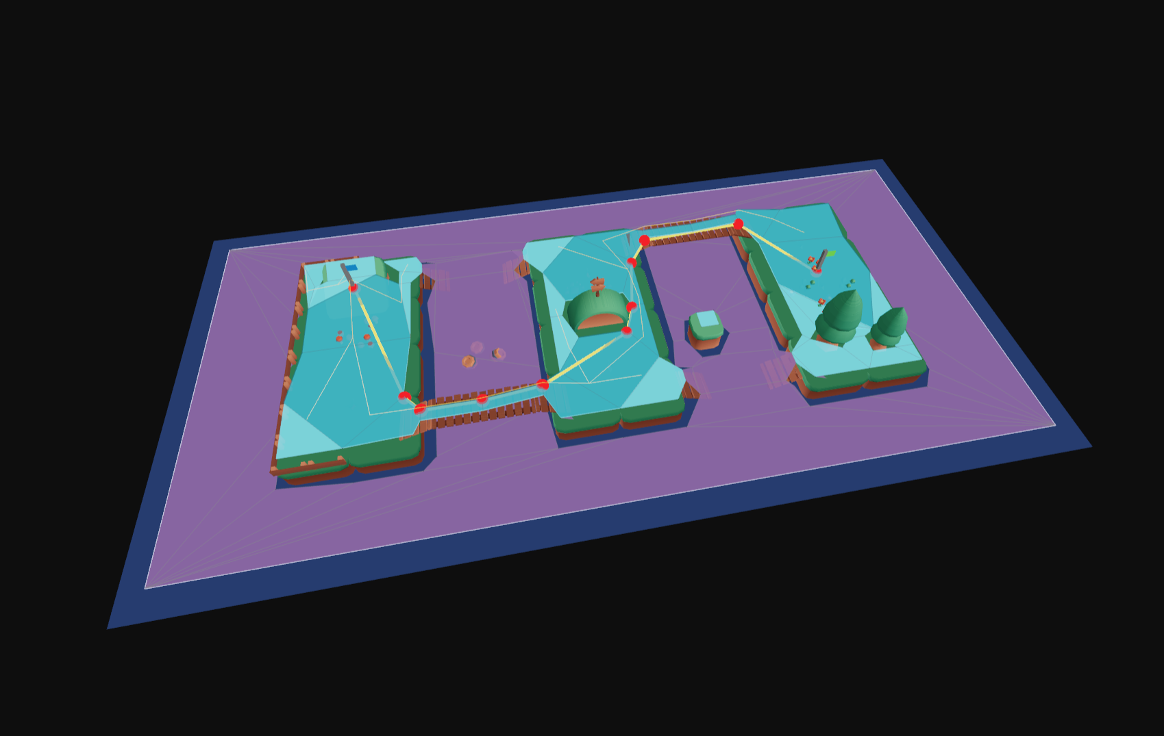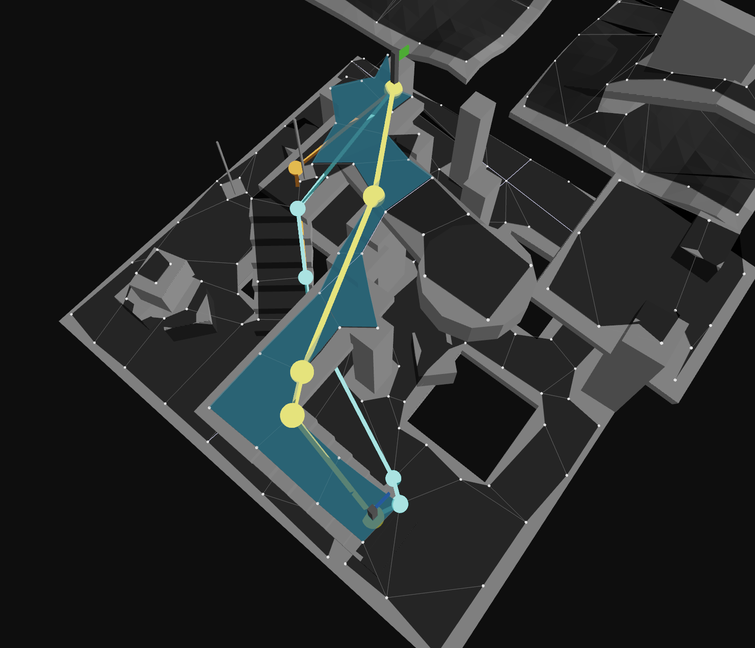 navcat/threeA navigation mesh (or navmesh) is a simplified representation of a 3D environment that is used for pathfinding and AI navigation in video games and simulations. It consists of interconnected polygons that define walkable areas within the environment. These polygons are connected by edges and off-mesh connections, allowing agents (characters) to move from one polygon to another.